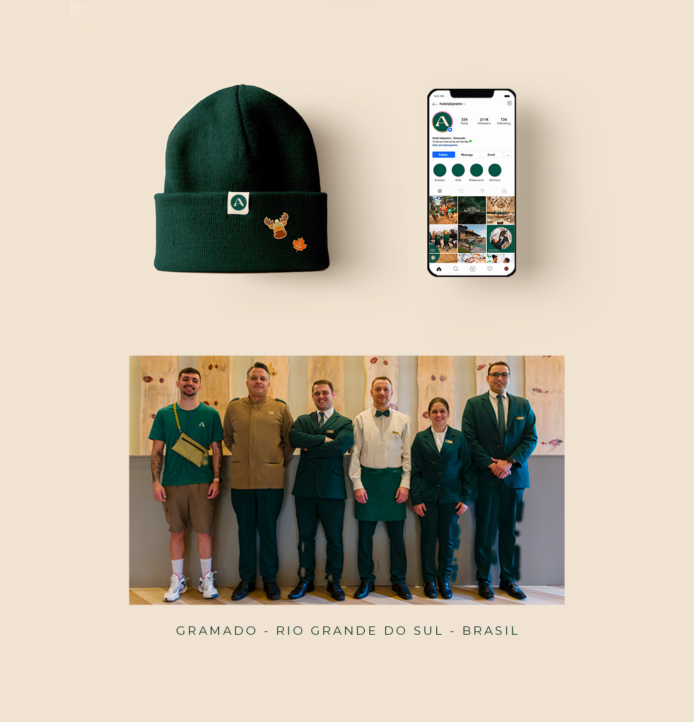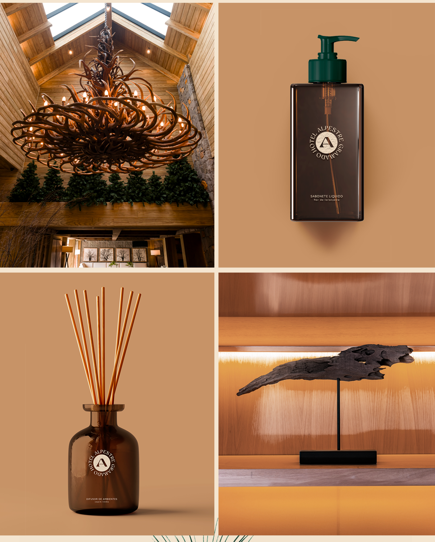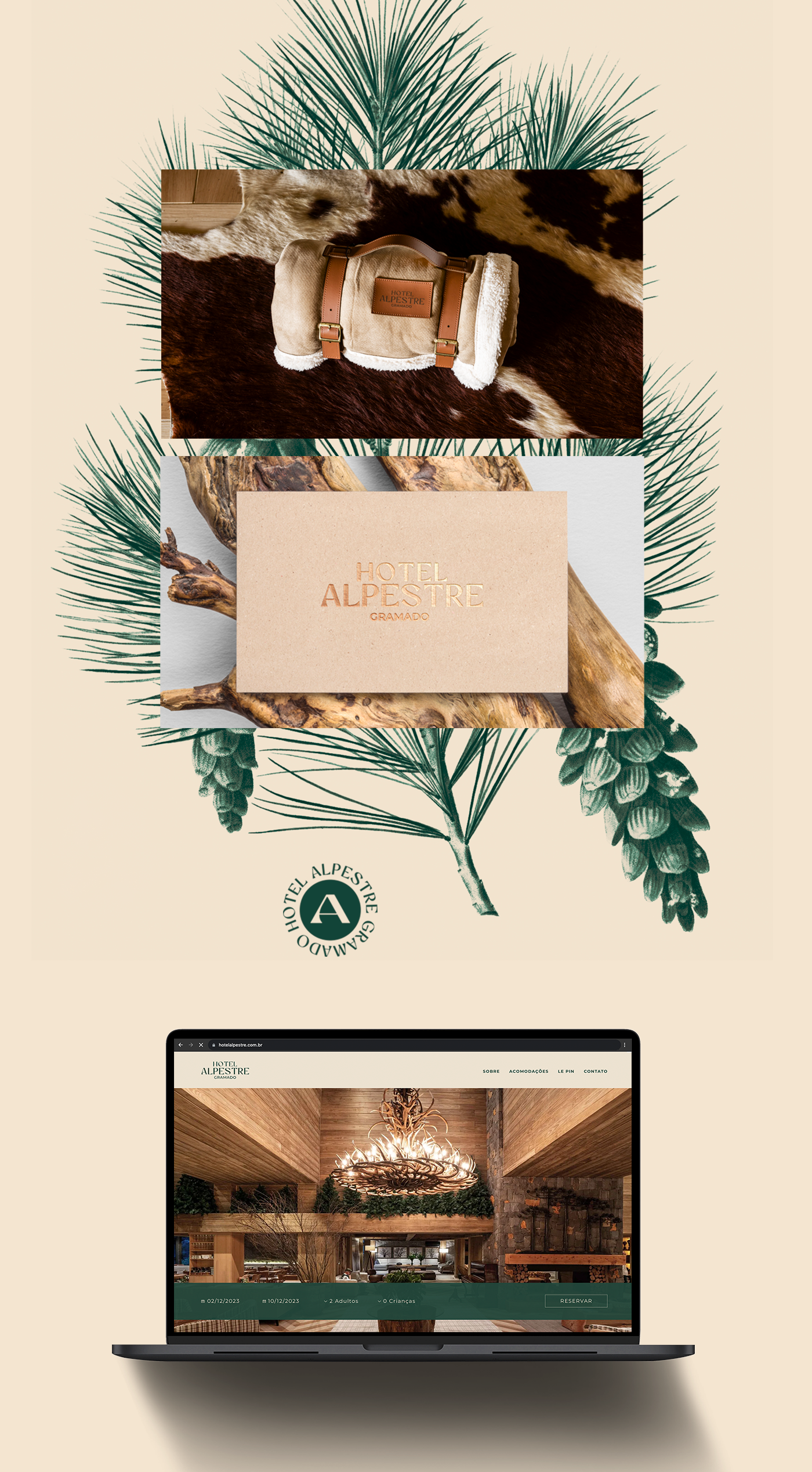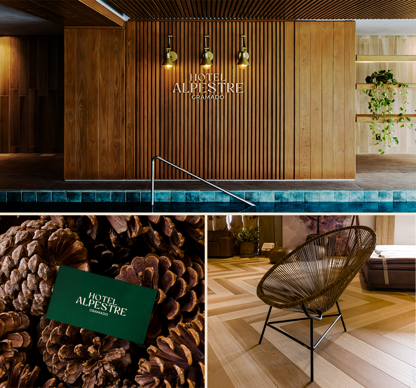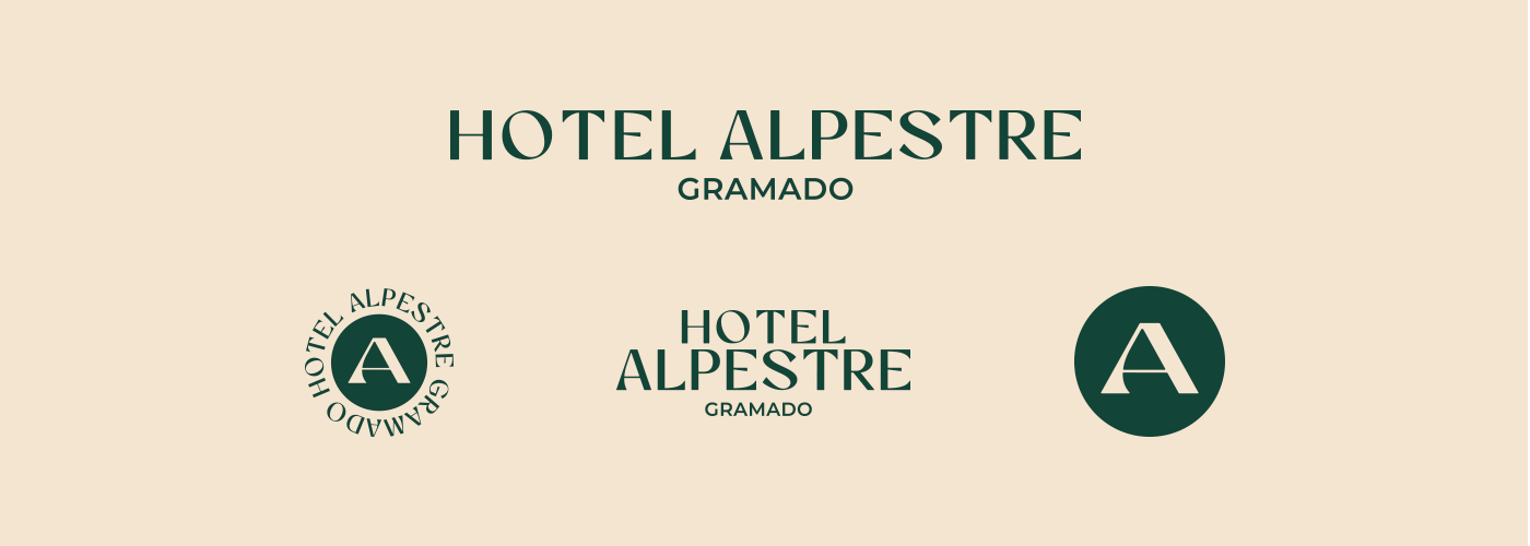 O antigo logotipo do Alpestre tinha uma influência europeia por causa da sua tipografia serifada, com detalhes e tamanhos diversos. Nossa ideia de refinamento foi suavizar e simplificar o desenho atual. Para a paleta de cores, mantivemos o verde original da marca e inserimos novos tons com base na arquitetura do hotel e elementos memoráveis de sua identidade, como a madeira e a vegetação local.